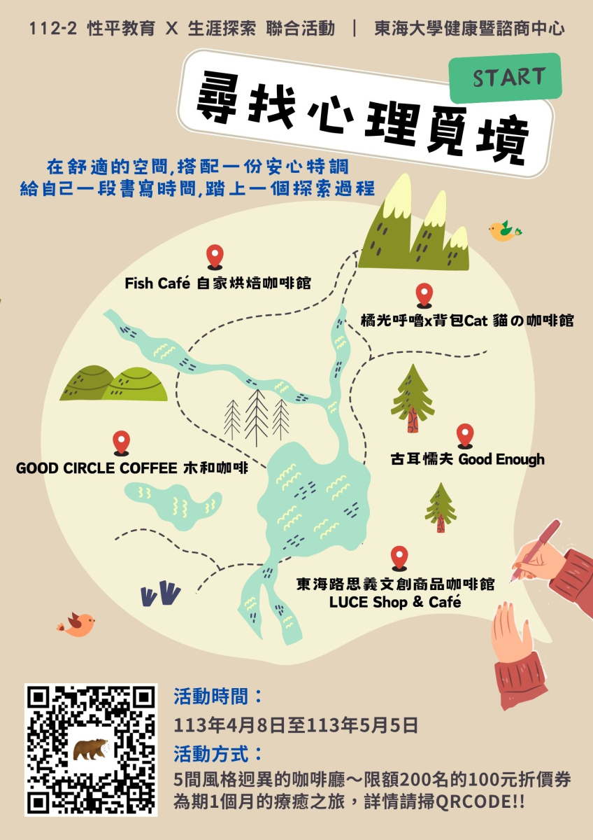 尋找心理覓境 沉浸式書寫療癒 開跑 東海諮商中心與友善店家,一起為你創造舒適一隅, 安放不舒服的情緒,獲得療癒的內在空間,擁有和情緒共處的小祕寶。